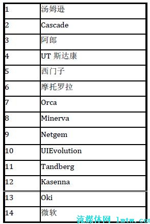 在中國(guó)市場(chǎng)上,UT 斯達(dá)康和中興公司暫時(shí)領(lǐng)先于其他公司。其中,UT 斯達(dá)康在海外也有不俗的表現(xiàn),如在印度和日本市場(chǎng)等;華為公司可以借助其整體解決方案的實(shí)力,有機(jī)會(huì)在下一代基于IMS 的IPTV 解決方案中脫穎而出。MRG 曾經(jīng)在2007 年3 月公布過(guò)一個(gè)市場(chǎng)調(diào)查,對(duì)IPTV 中間件及其市場(chǎng)影響力進(jìn)行了一個(gè)排名,具體的結(jié)果見表1。