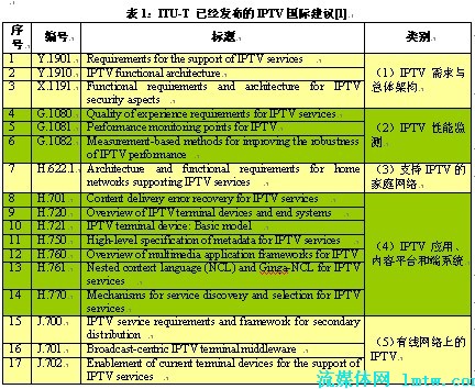 IPTV Forum)、日本IPTV論壇(IPTV FORUM JAPAN)等。ITU-T作為信息通信行業(yè)標(biāo)準(zhǔn)化的官方組織,自2006年就啟動(dòng)了相關(guān)工作,除了自身完成了多項(xiàng)核心國(guó)際標(biāo)準(zhǔn)(國(guó)際建議)外,還在協(xié)調(diào)全球標(biāo)準(zhǔn)化活動(dòng)方面發(fā)揮了重要作用。