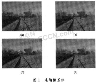 綜合考慮以上四種背景提取方法,本文采用結(jié)合多幀圖像平均法和連續(xù)幀差法這兩種方法來(lái)進(jìn)行視頻序列背景的提取?紤]到運(yùn)動(dòng)目標(biāo)的多樣性,有目標(biāo)經(jīng)過(guò)視場(chǎng)而引起的變化長(zhǎng)時(shí)間內(nèi)可忽略不計(jì)。多幀圖像平均法時(shí)將運(yùn)動(dòng)目標(biāo)看作為噪聲,用累加平均的方法消除噪聲,利用目標(biāo)運(yùn)行一段時(shí)間的序列圖像進(jìn)行平均而得到視場(chǎng)背景圖像。連續(xù)幀差算法是通過(guò)當(dāng)前幀的圖像與前一幀圖像的差值找到運(yùn)動(dòng)區(qū)域,對(duì)運(yùn)動(dòng)區(qū)域的背景保持不變,而非運(yùn)動(dòng)區(qū)域的背景則用當(dāng)前幀進(jìn)行更新,經(jīng)過(guò)一段時(shí)間的迭代便可提取出背景。兩種方法的結(jié)合可以很好地彌補(bǔ)各自的缺點(diǎn),能夠適應(yīng)鐵路沿線周邊環(huán)境的要求,對(duì)存在運(yùn)動(dòng)目標(biāo)的背景能夠提取出質(zhì)量較高的背景圖像。具體過(guò)程如下:
