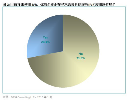 28.1%目前還沒有使用IVR系統(tǒng)的公司正在積極尋求語音自助服務(wù)解決方案來幫助自己達(dá)成目標(biāo),這一數(shù)字高得頗讓人驚訝。見圖2。經(jīng)濟(jì)衰退促使那些曾經(jīng)對使用自助服務(wù)技術(shù)猶豫不決的企業(yè)下定決心投資購買此類解決方案。一個具有正確規(guī)劃、設(shè)計(jì)和投放過程的IVR系統(tǒng)能夠?qū)⑷斯ご硖幚淼碾娫捔拷档?0%到90% (長期來說),具體數(shù)字有賴于聯(lián)絡(luò)中心的目的以及編入解決方案內(nèi)部的任務(wù)。IVR用戶的增長勢頭有望在經(jīng)濟(jì)形勢好轉(zhuǎn)之后仍然延續(xù)下去。一個經(jīng)過良好設(shè)計(jì)并成功實(shí)施的IVR方案所帶來的利益和節(jié)約的成本是即便最不情愿使用它的經(jīng)理都不得不承認(rèn)的。