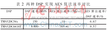 兩種處理器的架構(gòu)和處理速度是不同的,在軟件設(shè)計上會有不同的處理方法,若僅考慮DSP速率對算法速率的影響,本系統(tǒng)加密效率更高。另外,本測試僅考慮了AES加密算法代碼的指令開銷,實際中還要考慮DSP存取數(shù)據(jù)、中斷處理等其他任務(wù)。