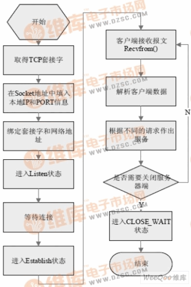 處理抽象。本應(yīng)用中需要派生一個(gè)QTcp 類,實(shí)現(xiàn)傳輸層的TCP 協(xié)議。一般基于 TCP 的網(wǎng)絡(luò)應(yīng)用程序都要繼承QTcp 類,然后在ESTABLISHED 狀態(tài)中添加 子狀態(tài)完成特定的功能。在服務(wù)器端,利用量子框架實(shí)現(xiàn)一個(gè)QServer 類,是一個(gè)活動(dòng)對(duì)象,繼承自QTcp 類。QServer 活動(dòng)對(duì)象同客戶端TCP Socket 連接后,進(jìn)入ESTABLISHED狀態(tài)中,通過調(diào)用Recvfrom 函數(shù)接收客戶端的請(qǐng)求,然后解析請(qǐng)求的服務(wù)類型,根據(jù)不同請(qǐng)求做出不同的服務(wù)。其軟件流程圖如圖1 所示: