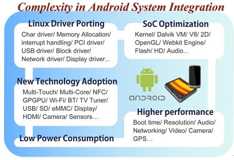 對(duì)廠商而言,開(kāi)發(fā)一款A(yù)ndroid設(shè)備,不僅僅只是將所有零組件組合成為一個(gè)產(chǎn)品那么容易,最大的學(xué)問(wèn)便在于將系統(tǒng)單芯片(System-on-a-chip,SoC)、各種新技術(shù)和Android系統(tǒng)進(jìn)行整合,SoC涉及像是Dalvik Virtual Machine、OpenGL、V8、Webkit Engine等上層的演算,與Android間的結(jié)合便必須透過(guò)不斷的嘗試與驗(yàn)證,才能研發(fā)出既符合成本效益、又有良好效能的優(yōu)化產(chǎn)品。目前市面上有些SoC廠商已針對(duì)Android系統(tǒng)的特性,提供整合過(guò)的SoC平臺(tái),將藍(lán)牙、相機(jī)或上網(wǎng)等常用功能模組預(yù)先寫(xiě)入,減少終端成品廠商費(fèi)力整合開(kāi)發(fā)的時(shí)間,但對(duì)廠商而言,這樣的預(yù)先整合是否適合自身產(chǎn)品,以及是否需要再作更細(xì)致的修改,則又是更困難的課題。