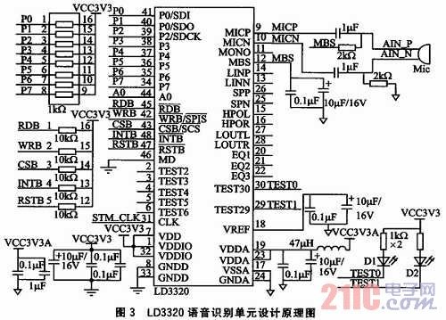 圖3為語音識別部分原理圖,參照了ICRoute發(fā)布的LD3320數(shù)據(jù)手冊進行設(shè)計。LD3320的內(nèi)部集成了快速穩(wěn)定的優(yōu)化算法,不需外接Fla-sh、RAM,不需要用戶事先訓(xùn)練和錄音而完成非特定人語音識別,識別準(zhǔn)確率高。
