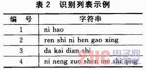 ②寫入識別列表。列表的規(guī)則是,每個識別條目對應(yīng)一個特定的編號(1個字節(jié)),編號可以相同,可以不連續(xù),但是數(shù)值要小于256(00H~FFH)。本芯片最多支持50個識別條目,每個識別條目是標(biāo)準(zhǔn)普通話的漢語拼音(小寫),每2個字(漢語拼音)之間用一個空格間隔。本文中采取了連續(xù)不同編號的識別條目,表2是簡單的示例。