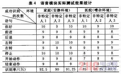 測試中的3個非特定人中,非特定人1為女性,非特定人2和非特定人3為男性。由表中數(shù)據(jù)可以看出,家庭環(huán)境下對非特定人的語音識別率可達到90%以上,嘈雜的醫(yī)院環(huán)境下的語音識別率也可達82.5%以上。識別率方面,在嘈雜環(huán)境下比在安靜環(huán)境下的語音識別率有所降低;穩(wěn)定性方面,在安靜環(huán)境下系統(tǒng)的穩(wěn)定性較好,語音說1遍,最多說2遍模塊就可以做出正確的響應(yīng);在噪聲環(huán)境下,系統(tǒng)的穩(wěn)定性有所下降,個別語音命令需要說3遍甚至3遍以上才能被模塊準(zhǔn)確識別;實時性方面,在安靜環(huán)境下的語音能保證系統(tǒng)響應(yīng)的實時性,響應(yīng)時間一般不超過1 s,在噪聲環(huán)境下的響應(yīng)時間相對長一些。