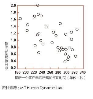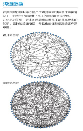 去年,彭特蘭的實(shí)驗室與美國銀行(Bank of America)設(shè)在羅得島(Rhode Island)的呼叫中心合作,在80 名中心員工身上安裝了社會傳感器。這種傳感器看起來像一枚不顯眼的徽章,使用藍(lán)牙和紅外信號監(jiān)測實(shí)驗對象每分鐘與哪些同事交談。測試活動先開展了一個月,后來又進(jìn)行了6周。第一個月后,實(shí)驗室的研究人員發(fā)現(xiàn),與更多同事進(jìn)行過交談的員工能夠更快地接通電話,他們自我感覺的壓力也相對較小,而客戶滿意度卻與其他人一樣高。與刻板地遵循員工手冊或服從經(jīng)理的電子郵件指示相比,通過非正式的閑聊來交流問題和解決方案似乎能取得更好的結(jié)果。有了這種結(jié)論之后,該呼叫中心嘗試盡量將員工的休息時間安排在一起,而非像過去那樣錯開。這樣員工就有了更多的時間參與閑聊。幾個月后,美國銀行向?qū)嶒炇覉蟾媪私Y(jié)果:該呼叫中心獲得了相當(dāng)于每年1,500 萬美元的生產(chǎn)力提升。