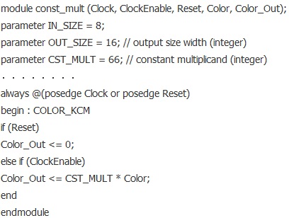 模塊csc.v中,調(diào)用const_mult模塊,通過(guò)參數(shù)傳遞改變參數(shù)IN_SIZE,OUT_SIZE,CST_MULT的值,然后實(shí)現(xiàn)加法運(yùn)算。
