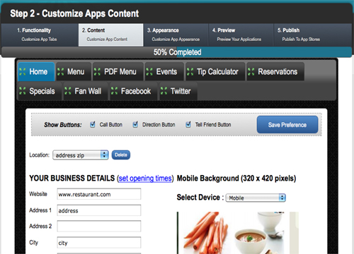 Bizness Apps采用可視化操作界面,用戶只需要點(diǎn)擊設(shè)置相關(guān)選項(xiàng)就能完成應(yīng)用的開發(fā)工作。因此,Bizness Apps很適合缺少專業(yè)技術(shù)人員的小企業(yè)開發(fā)本行業(yè)應(yīng)用。利用Bizness Apps開發(fā)行業(yè)應(yīng)用只需五步。首先,開發(fā)者選擇對(duì)應(yīng)的行業(yè)后,需要為應(yīng)用添加功能組件。第二步,為訂制好的功能組件添加內(nèi)容。第三步,為應(yīng)用選定外觀的設(shè)計(jì)方案。第四步,預(yù)覽經(jīng)過定制后的應(yīng)用。最后,完成付費(fèi)后即可發(fā)布你的應(yīng)用。