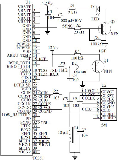 本系統(tǒng)選用的GSM模塊是西門子的TC35I模塊,這款無(wú)線模塊是一個(gè)支持中文短信息的工業(yè)級(jí)的GSM模塊,工作在EGSM900和GSM1800雙頻段,電源范圍為直流3.3~4.8V,電源消耗:休眠狀態(tài)時(shí)為3.5mA,空閑狀態(tài)時(shí)為25mA,發(fā)射狀態(tài)為300mA、2.5A峰值;可以輸出語(yǔ)音和數(shù)據(jù)信號(hào),功耗在EGSM900和GSM1800分別為2W和1W,通過接口連接器和天線連接器分別連接SIM卡讀卡器和天線。SIM電壓為3V/1.8V,TC35I