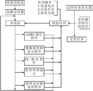 該下位機(jī)軟件設(shè)計(jì)包括主程序、顯示子程序和通信服務(wù)程序的設(shè)計(jì)。主程序主要完成中斷的初始化和串口的初始化設(shè)置。顯示程序主要完成數(shù)據(jù)的各種顯示,顯示部分采用動(dòng)態(tài)掃描的方式,實(shí)現(xiàn)對(duì)顯示屏要顯示的漢字、圖像、字符等數(shù)據(jù)信息進(jìn)行傳輸控制以及顯示等功能。通信服務(wù)程序主要完成GPRS的數(shù)據(jù)接收、數(shù)據(jù)的分割處理、數(shù)據(jù)的發(fā)送等任務(wù)。本文采用模塊化程序設(shè)計(jì),程序各部分的功能由各個(gè)模塊分別實(shí)現(xiàn)。程序模塊有:系統(tǒng)初始化模塊、GPRS通信模塊、數(shù)據(jù)的處理和存儲(chǔ)模塊、I2C通信模塊。為了保證系統(tǒng)工作的實(shí)時(shí)性和高效性,本系統(tǒng)采用了實(shí)用單片機(jī)系統(tǒng)MS3,MS3是一套針對(duì)MCU51的開發(fā)平臺(tái),借簽了VC編程的消息機(jī)制,把各個(gè)功能有效地組織起來(lái)。RTOS的系統(tǒng)時(shí)鐘,實(shí)現(xiàn)高效的按鍵掃描和快速的響應(yīng)中斷,執(zhí)行例行程序。顯示終端主程序如圖所示。