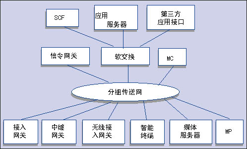 接入層包括各種接入網(wǎng)關(guān)、中繼網(wǎng)關(guān)、無(wú)線接入網(wǎng)關(guān)、智能終端以及與處理媒體有關(guān)的媒體服務(wù)器和多點(diǎn)處理器(MP)。傳送層包括提供IP包轉(zhuǎn)發(fā)的各種承載網(wǎng)功能實(shí)體。控制層是NGN網(wǎng)絡(luò)的核心,主要包括軟交換設(shè)備、信令網(wǎng)關(guān)和多點(diǎn)處理器。業(yè)務(wù)層則主要包括應(yīng)用服務(wù)器、第三方應(yīng)用接口和傳統(tǒng)智能網(wǎng)功能。該業(yè)務(wù)層通過(guò)開(kāi)放的業(yè)務(wù)層接口向用戶提供傳統(tǒng)智能網(wǎng)業(yè)務(wù)、多樣化的第三方業(yè)務(wù)和增值業(yè)務(wù)。