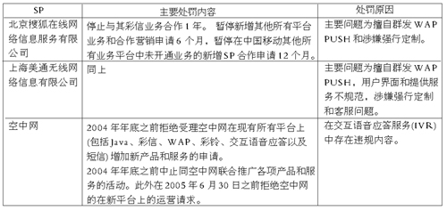 一方面是信息產(chǎn)業(yè)部管理手段的加強(qiáng),另一方面則是運(yùn)營(yíng)商管理方式的嚴(yán)肅,從表格中可以看出,中國(guó)移動(dòng)對(duì)SP的懲罰已經(jīng)具有相當(dāng)?shù)牧Χ取T跒樵鲋硺I(yè)務(wù)打造了相關(guān)的業(yè)務(wù)品牌之后,整個(gè)產(chǎn)業(yè)鏈條的控制權(quán)目前還是掌握在運(yùn)營(yíng)商手中。