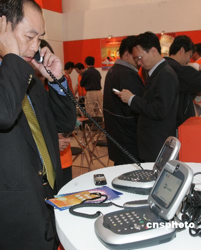 圖為展會上展出的一款便攜式小型可視電話機,