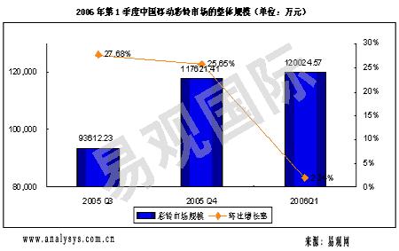 新華美通消息:易觀國際研究表明,2006年第一季度,CRBT 業(yè)務(wù)整體市場規(guī)模達到16億元,環(huán)比增長率為5%,增長速度較上個季度大幅度下降,業(yè)務(wù)已經(jīng)進入低級飽和期。其中中國移動的彩鈴業(yè)務(wù)的市場規(guī)模環(huán)比增長率僅僅為2%,如果扣除中國移動和中央電視臺合作進行的春晚彩鈴業(yè)務(wù)收入,中國移動彩鈴業(yè)務(wù)市場規(guī)模實際略有下降。