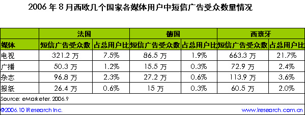 iResearch艾瑞市場咨詢根據(jù)eMarketer資料整理顯示,短信廣告在西歐國家大行其道,成百上千萬的移動(dòng)用戶訂閱了廣告短信。西歐各國不同媒體訂閱廣告短信的用戶數(shù)不盡相同?傮w上來看,西班牙的短信廣告受眾最多,電視用戶中有21.7%人訂閱了短信廣告,數(shù)量達(dá)663.3萬。相比之下,法國電視用戶中的短信廣告受眾只有西班牙的1/2,德國則更少。