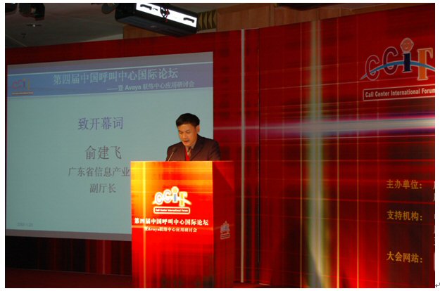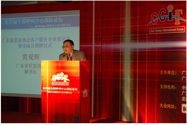由廣東省信息協(xié)會、廣東省電子商務(wù)協(xié)會聯(lián)合主辦,廣東省信息協(xié)會客戶服務(wù)專業(yè)委員會、廣州市品派文化傳播有限公司策劃承辦,AVAYA公司總協(xié)辦的第四屆中國呼叫中心國際論壇于2007年1月23日在廣州亞洲國際大酒店隆重舉行,廣東省信息產(chǎn)業(yè)廳副廳長俞建飛出席會議并致開幕詞。會上,廣東省信息協(xié)會秘書長黃觀輝、AVAYA公司銷售總經(jīng)理?xiàng)畛、民生銀行電子銀行部華南運(yùn)營中心總經(jīng)理李濤、網(wǎng)易客戶服務(wù)部總監(jiān)張云等分別做了主題發(fā)言。來自全國各地300多位企業(yè)管理人員參加了本次論壇。