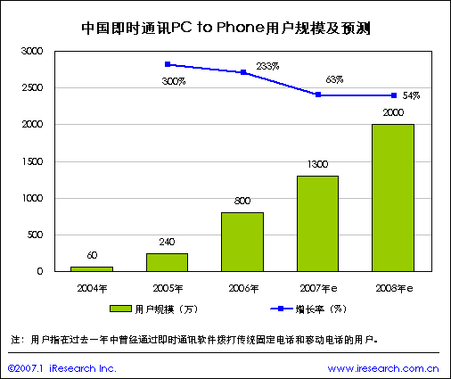 2004年10月以前中國使用PC to Phone的VOIP用戶非常少,且主要是使用國外運營商提供的服務,像Skype、TELTEL和dialpad等。隨著Skype登錄中國,一些國內(nèi)公司聯(lián)合地方的電信運營商以“增值服務”的形式推出具有PC to Phone功能的即時通訊軟件。