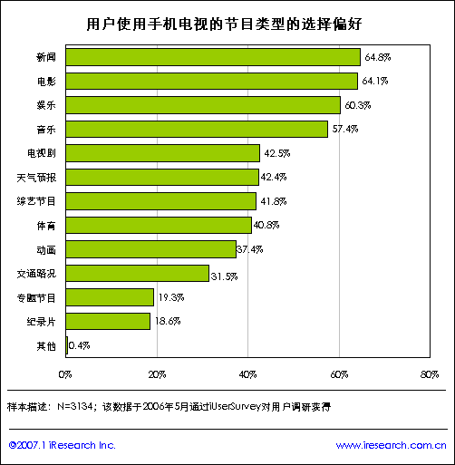 iReserach艾瑞市場(chǎng)咨詢《2007年手機(jī)電視研究報(bào)告》研究結(jié)果顯示,手機(jī)終端價(jià)格將是影響用戶使用手機(jī)電視業(yè)務(wù)的首要驅(qū)動(dòng)因素,其次是手機(jī)電視服務(wù)資費(fèi)標(biāo)準(zhǔn)。另外研究數(shù)據(jù)發(fā)現(xiàn),手機(jī)用戶希望在手機(jī)電視上看到的內(nèi)容類別情況:新聞、電影、娛樂和音樂是用戶首要選擇的電視節(jié)目類型,用戶的提及率均在60%以上,另外用戶希望能夠通過手機(jī)看電視劇、天氣預(yù)報(bào)、綜合節(jié)目和體育等節(jié)目類型。由此發(fā)現(xiàn),新聞、娛樂和生活類資訊是用戶期望手機(jī)電視節(jié)目的重要類型。