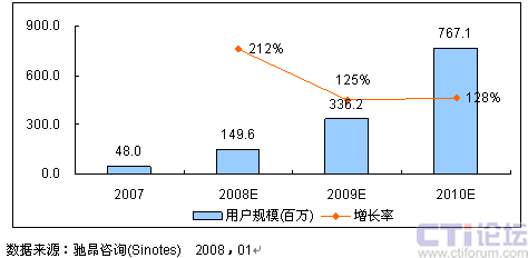 馳昂咨詢(xún)(Sinotes)發(fā)布的《2007-2008年中國(guó)3G后視頻應(yīng)用市場(chǎng)研究報(bào)告》顯示,2007年,中國(guó)視頻應(yīng)用市場(chǎng)規(guī)模為233.7億元,比2006年同期增長(zhǎng)了84%,用戶(hù)規(guī)模近4800萬(wàn),比2006年的2300萬(wàn)翻了一番。馳昂咨詢(xún)的分析師孟慶雯認(rèn)為,這主要得益于產(chǎn)業(yè)鏈各方在利用現(xiàn)有2.5G/2.75G網(wǎng)絡(luò)開(kāi)展視頻應(yīng)用服務(wù)上做的有益嘗試。產(chǎn)業(yè)鏈各方的努力加快了3G視頻應(yīng)用市場(chǎng)培育步伐,基本滿(mǎn)足了在現(xiàn)有網(wǎng)絡(luò)條件下用戶(hù)對(duì)視頻服務(wù)的需求,確保了由2.5G/2.75G向3G的業(yè)務(wù)銜接和過(guò)渡。