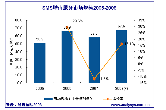 2007年SMS增值服務(wù)的市場(chǎng)規(guī)模(不含點(diǎn)對(duì)點(diǎn))達(dá)到58.2億,環(huán)比下降了11.7% ,市場(chǎng)下降的主要原因包括: