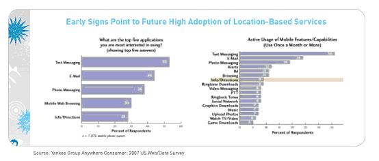 當(dāng)美國聯(lián)邦通信委員會(FCC)在2001年強制要求實施911增強功能時,移動行業(yè)就開始通過將導(dǎo)航服務(wù)引入大眾市場來獲利。7年后,絕大多數(shù)手機都集成了GPS功能,幾大主要的移動運營商也都計劃在年內(nèi)推出至少一項基于GPS 的導(dǎo)航應(yīng)用。揚基集團認(rèn)為,2008年正在成為美位置服務(wù)的轉(zhuǎn)折點。