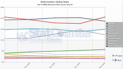根據(jù)StatCounter的統(tǒng)計數(shù)字,Opera的移動瀏覽器在5月幾乎完全從2009年一到四月每月穩(wěn)定下降三個百分比的低潮中恢復過來了。StatCounter在1月特別點出 Opera在移動瀏覽市場的占有24.69%,比這個月高出0.05%。不論這個月的使用數(shù)字到底為何,至少數(shù)字回升了,這無疑是Opera值得驕傲的事。