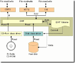 EWF能夠使操作系統(tǒng)可以從只讀媒體(如 CD ROM、寫保護(hù)硬盤或閃存)中啟動(dòng)。所有對(duì)受到 EWF保護(hù)的卷進(jìn)行的寫入都被重定向到覆蓋。這些寫入被緩存在覆蓋中并且作為卷的一部分提供。這會(huì)產(chǎn)生該卷可寫的表象。覆蓋可能存在于磁盤或隨機(jī)訪問內(nèi)存 (RAM) 中。如果需要,可以將覆蓋中存儲(chǔ)的數(shù)據(jù)提交給受保護(hù)的卷。