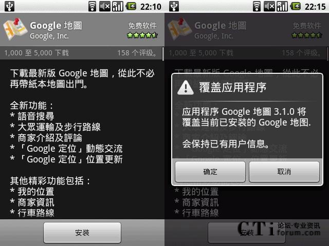 值得注意的是,Google Maps并不會(huì)自動(dòng)推送升級(jí),用戶需要到Market搜索Google Maps手工下載這個(gè)升級(jí),版本號(hào)為3.10,如下圖: