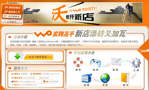 上海聯(lián)通在該網(wǎng)站特別設(shè)定“我家開新店”版塊,為新店征名,同時(shí)尋求軟件開發(fā)伙伴,并稱包括不限于娛樂、游戲、應(yīng)用、工具、閱讀等類別,一旦合作就可參與收益分成,最高可達(dá)70%。