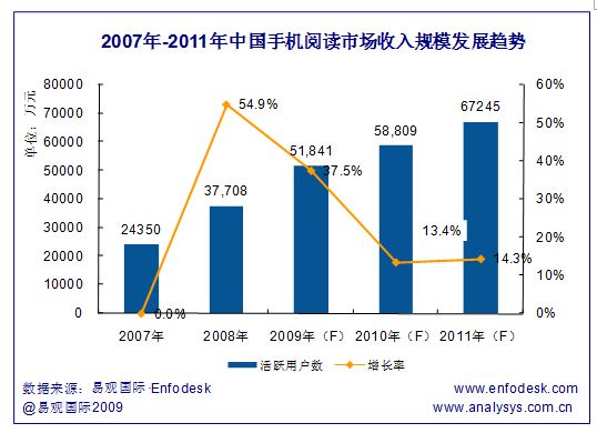 盈利模式日漸清晰。用戶付費意愿的不斷增強、廣告盈利模式及多版權運營等盈利模式的成熟,手機閱讀市場收入規(guī)模將不斷攀升。預計2010年,中國手機閱讀市場營收將達到5.9億元,甚至更多,年增長率將達到13.4%。