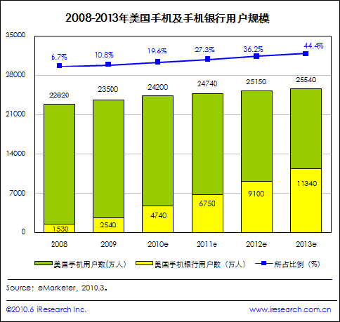 艾瑞咨詢根據(jù)eMarketer的統(tǒng)計數(shù)據(jù)發(fā)現(xiàn),2010年美國手機銀行用戶占其手機用戶的比例將達(dá)到19.6%,到2013年將增長至44.4%。