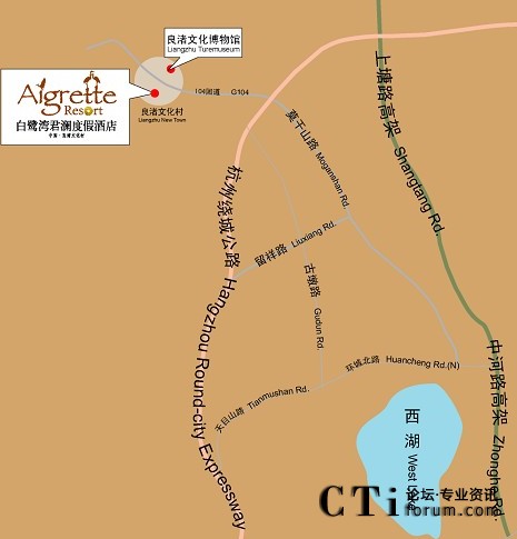 杭州城站火車站——西湖大道(入口)——中和路高架(出口)——勾運路——莫干山路(過勾莊收費站)——新104國道(大陸出口)——良渚文化村——杭州白鷺灣君瀾度假酒店