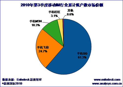 CTI論壇(ctiforum)11月15日消息(記者 楊佳林):根據(jù)Enfodesk易觀智庫(kù)產(chǎn)業(yè)數(shù)據(jù)庫(kù)最新發(fā)布的數(shù)據(jù)顯示,2010年第3季度中國(guó)手機(jī)IM市場(chǎng)累計(jì)賬戶數(shù)達(dá)到了4.375億戶,環(huán)比增長(zhǎng)4.9%。從市場(chǎng)格局來(lái)看,和前幾個(gè)季度一樣,累積賬戶數(shù)前三名分別是手機(jī)QQ、手機(jī)飛信、手機(jī)MSN。具體的市場(chǎng)份額情況如下圖所示: