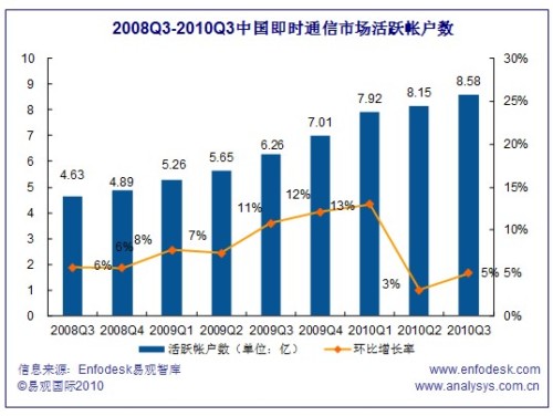 2010Q3中國即時通信市場活躍帳戶數超過8.58億
