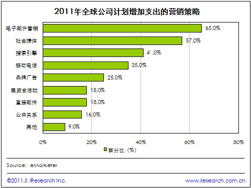 iResearch艾瑞咨詢根據(jù)eMarketer發(fā)布的調(diào)查研究報告發(fā)現(xiàn),2011年,全球65%的公司將在電子郵件營銷中增加支出,57%的公司愿意在社會媒體營銷中增加開支;而愿意在其他營銷策略增加支出的公司均未超過五成。