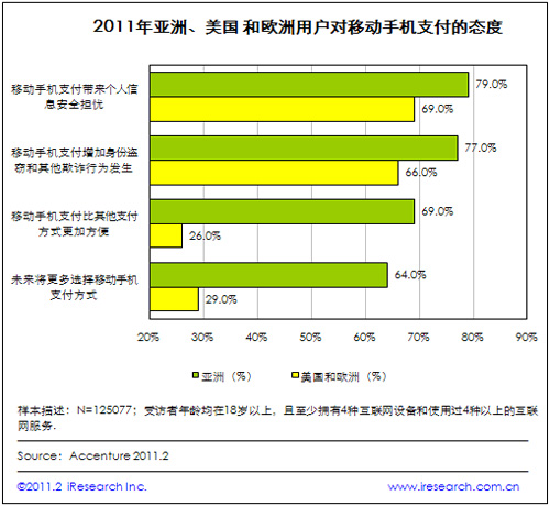 iResearch艾瑞咨詢根據(jù)Accenture的研究調(diào)查數(shù)據(jù)發(fā)現(xiàn),移動(dòng)手機(jī)支付安全問(wèn)題受到全球用戶的普遍關(guān)心。根據(jù)2011年Accenture對(duì)亞洲、美國(guó)以及歐洲125077位手機(jī)用戶進(jìn)行的網(wǎng)上調(diào)查顯示,亞洲79%的受訪者擔(dān)心移動(dòng)手機(jī)支付帶來(lái)的個(gè)人信息安全隱患,77%的受訪者擔(dān)心身份盜竊和其他欺詐行為的發(fā)生;美國(guó)和歐洲擔(dān)心以上安全問(wèn)題的用戶也分別占到69%和66%。