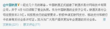 中國(guó)聯(lián)通正式組建支付公司“沃易付”