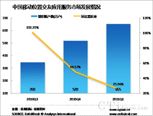 2011年Q1中國移動(dòng)位置交友應(yīng)用累計(jì)帳戶數(shù)達(dá)655萬