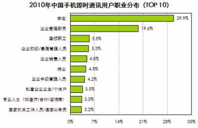 一系列研究數(shù)據(jù)足以說明些問題。研究公司艾瑞咨詢報告數(shù)據(jù)顯示,2010年中國手機(jī)上網(wǎng)用戶達(dá)到3.03億,在總網(wǎng)民數(shù)中占比約為66.3%。這其中,57.4%的用戶使用即時通訊服務(wù),位列手機(jī)上網(wǎng)用戶十大行為的第二位。
