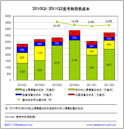 2011Q2麥考林運營費用為2688萬美元,同比增加22.6%。據(jù)麥考林CFO披露,2011Q2市場營銷費用收入的比例為14%,即822萬美元(2011Q1市場營銷費用收入比例為13%,即625萬美元,且60%用于線上渠道,40%用于呼叫中心渠道),行政與管理費用達到1774萬美元的水平。