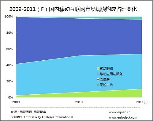 對(duì)比2009年到2011年市場(chǎng)規(guī)模的構(gòu)成變化可以了解到,2011年移動(dòng)購(gòu)物與無(wú)線廣告在規(guī)模占比上都有了很大的提高,尤其是移動(dòng)購(gòu)物,從2009年的規(guī)模占比3%增長(zhǎng)到11%,用戶對(duì)通過(guò)移動(dòng)終端購(gòu)物的習(xí)慣整逐步被得到培養(yǎng),另外值得注意的是2011年移動(dòng)互聯(lián)網(wǎng)流量費(fèi)占比低于50%,已經(jīng)從2009的58%減少至42%。