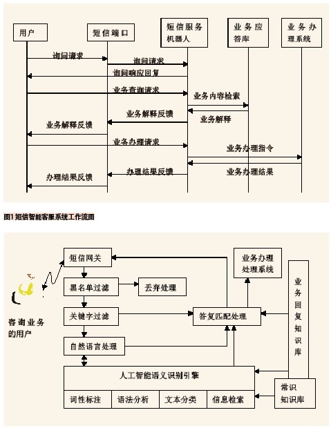 通過自然語(yǔ)言與用戶交互時(shí),降低短信自助服務(wù)的使用門檻,讓所有用戶都能輕易使用。這就要求提供短信服務(wù)的計(jì)算機(jī)系統(tǒng)具有將自然語(yǔ)言系統(tǒng)轉(zhuǎn)換為計(jì)算機(jī)程序能夠處理的形式,并且能將處理結(jié)果轉(zhuǎn)換回自然語(yǔ)言系統(tǒng)。在自然語(yǔ)言處理技術(shù)中,通過特定的計(jì)算機(jī)程序?qū)Χ绦虐l(fā)來(lái)的自然語(yǔ)言進(jìn)行詞性標(biāo)注、語(yǔ)法分析、文本分類、信息檢索匹配等一系列處理判斷出用戶的請(qǐng)求意圖,再根據(jù)信息檢索匹配預(yù)置的回復(fù)結(jié)果以短信形式反饋給用戶。