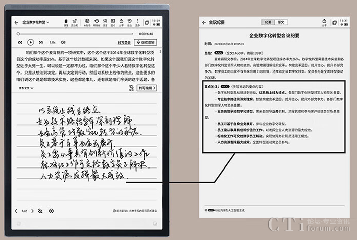 其中會議紀要功能,可將科大訊飛智能辦公本的語音實時轉寫功能與墨水屏紙感書寫相結合,并且可以對會議記錄內容形成一份精簡的會議紀要,有助于快速回溯會議內容。