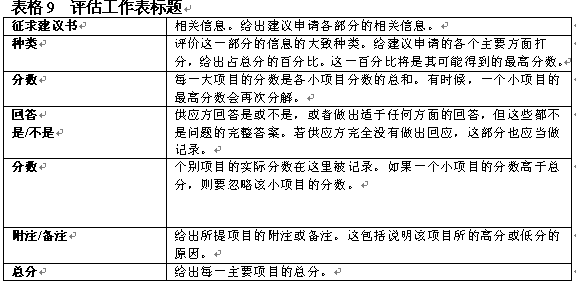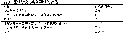 。。在決定了初步要求之后,評估小組應(yīng)具體地開展評估工作。具體評估的目標(biāo)是通過給建議書主要方面打分作出評估?梢栽谒愠鼋ㄗh書各方面占總分?jǐn)?shù)的百分比,如表8中對各方面的總覽。一般在建議書內(nèi)向提供者給出這一信息。
