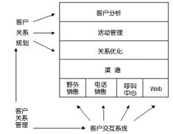 真正的CRM解決方案是一個復(fù)雜的聯(lián)合體,它由許多組件(即分析工具、活動管理與事件引發(fā)等)與許多需要用來達到一對一的營銷能力(如間接管理、基于規(guī)章制度的工作流管理以及真正的渠道管理等)的新組件共同組成。此外,在非客戶聯(lián)系系統(tǒng)(如企業(yè)資源規(guī)劃與操作)與客戶聯(lián)系系統(tǒng)之間必須有接口。最后,在企業(yè)內(nèi)建立一套完整的便于知識管理的反饋循環(huán)系統(tǒng)也很必要。