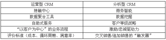 一般情況下CRM的可分為兩大類:即運(yùn)營型CRM和分析型CRM。(有時把"協(xié)作型CRM"單獨作為一類)。多數(shù)情況之下運(yùn)營型CRM引用的是產(chǎn)品,服務(wù)和一個企業(yè)實際能夠"照料"客戶的運(yùn)做能力。關(guān)系中心,數(shù)據(jù)集合系統(tǒng)及Web站點僅僅是一些例子。分析型CRM主要指用來推動"以客戶為中心"的戰(zhàn)略和工具。商務(wù)智能系統(tǒng),數(shù)據(jù)挖掘工具及客戶層級戰(zhàn)略都可以算在這個范疇之內(nèi)。