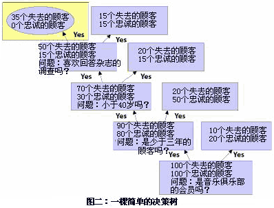 你可以從它的名字中猜到,決策數(shù)是一種樹型分析模型。樹枝代表了用來定義或者細(xì)分客戶的不同問題。比如,假設(shè)一家音樂俱樂部想要分析為什么一些會(huì)員不會(huì)再次申請(qǐng)它的會(huì)員資格(該俱樂部會(huì)員采取月申請(qǐng)制)。為了形成決策樹,公司召集了一批由100個(gè)忠誠顧客、100個(gè)非忠誠或者已經(jīng)公司已經(jīng)失去的顧客組成的測試小組。然后,公司開始提出一系列問題,要求顧客形容一下忠誠的顧客和非忠誠的顧客是什么樣子的。整個(gè)決策樹就如圖二所示。
