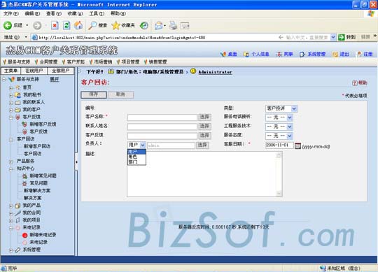 頁(yè)面的最頂端將本系統(tǒng)分為服務(wù)與支持、合同管理、客戶開(kāi)拓、市場(chǎng)營(yíng)銷(xiāo)、項(xiàng)目管理、銷(xiāo)售管理六板塊進(jìn)行陳列以方便管理,同時(shí)左側(cè)是詳細(xì)的樹(shù)形結(jié)構(gòu)圖,所有功能一目了然。本系統(tǒng)實(shí)現(xiàn)了將不同業(yè)務(wù)、客服人員涉及的客戶資料進(jìn)行了全面而且條理的整理匯集,整合團(tuán)隊(duì)的力量提供完善的服務(wù)。