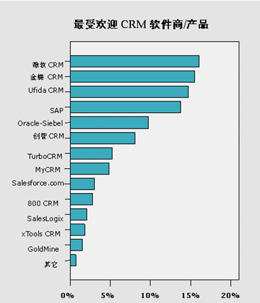 而在此類(lèi)調(diào)查中一直名列前茅的國(guó)外CRM軟件商三巨頭SAP和 Oracle-Siebel(由于Siebel已被Oracle兼并,現(xiàn)以O(shè)racle-Siebel代替),在本次知名度調(diào)查中則落后于以上三家CRM軟件商。SAP和Oracle-Siebel的這一比例分別為13.80%和9.74%。